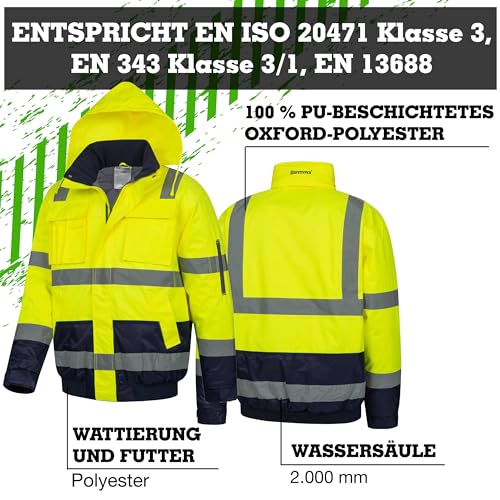 | Features | HOHE SICHTBARKEIT: Zertifiziert nach EN ISO 20471 Klasse 3 für optimale Sichtbarkeit bei Tag und Nacht., WASSER- & WINDDICHT: Obermaterial aus 100% Polyester mit PU-Beschichtung und 2.000 mm Wassersäule hält Sie trocken und warm., FUNKTIONAL & BEQUEM: Integrierte Kapuze, Fleece-gefütterter Kragen, weitenregulierbare Ärmelbünde mit Strickbund, Strickbund am Saum, Schulterreflexstreifen., VIELSEITIGE TASCHEN: 1 Ärmeltasche mit Reißverschluss, 2 Brusttaschen mit Patten (rechte Seite mit Stift- und Handytasche), 2 Seitentaschen und 1 Innentasche im Futter., ROBUST & LANGLEBIG: Hochwertige Materialien und Verarbeitung garantieren Langlebigkeit und Komfort im Arbeitsalltag. |