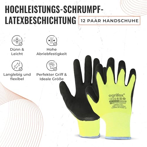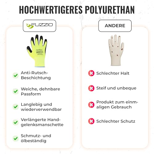 Die FUZZIO Arbeitshandschuhe bieten ausgezeichneten Grip und Komfort dank der Latex-Beschichtung. Mit ihrem leuchtenden Neon-Design sorgen sie für Sicherheit bei der Arbeit und sind ideal für Mechaniker und Gartenliebhaber.