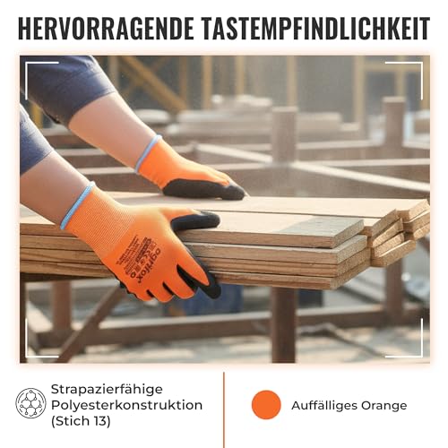 FUZZIO 12 Paar Arbeitshandschuhe Herren Gr 10, Mechaniker Handschuhe neonorange, Gartenhandschuhe Herren, Arbeitshandschuhe Damen, Montagehandschuhe Herren, Schrumpf Latex Beschichtung Handschuhclip