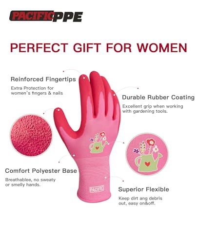 PACIFIC 6 Paar Gartenhandschuhe für Damen, Gartenhandschuhe mit rutschfeste Crinkle Latex Beschichtung, robuste Handschuhe Größe 7/S