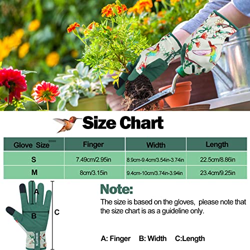 | Features | Weich und Atmungsaktiv: Die Handfläche unserer Damen-Gartenhandschuhe besteht aus Mikrofaserleder, das sehr weich ist und Ihnen hohe Fingerfertigkeit und Komfort bietet. Die Rückseite der Gartenhandschuhe besteht aus atmungsaktivem Stoff auf der Rückseite des Handschuhs, um Ihre Hände trocken zu halten, während Sie im Garten arbeiten.Achtung: Damen Gartenhandschuhe sind nicht stichfest, bitte tragen Sie sie nicht, um Pflanzen mit Dornen zu berühren, um Verletzungen zu vermeiden, Elastisches Handgelenk: Die Handgelenke der Gartenhandschuhe für Damen sind mit einem elastischen Handgelenk ausgestattet, das sich perfekt an Ihre Hände anpasst, guten Halt bietet und sich leicht an- und ausziehen lässt. So gelangen weder Staub noch Schmutz in den Handschuh und die Gartenarbeit macht mehr Spaß, Touchscreen Finger: Daumen und Zeigefinger von Damen Gartenhandschuhen verfügen über einen Touchscreen, der mit elektronischen Geräten wie Mobiltelefonen, Tablets usw. kompatibel ist, wenn Sie Gartentipps surfen, Ihre Ernte in sozialen Medien posten und gleichzeitig arbeiten, können Sie das elektronische Gerät direkt verwenden, ohne es an- oder auszuziehen, Perfekter Schutz: Die Gartenhandschuhe für Damen sind mit hochdichten Nähten ausgestattet, und wir haben außerdem eine Schwammschicht im Handflächenbereich hinzugefügt, die verschleißfest ist und gleichzeitig gute Reibung und zusätzlichen Halt bietet, Ihnen Schutz bietet und die Gartenarbeit einfacher und sicherer macht, Vielfältige Einsatzmöglichkeiten: Diese Damen-Gartenhandschuhe aus Mikrofaser-Leder eignen sich perfekt für Bauarbeiten, Gartenarbeiten, Gartenarbeiten, Landwirtschaft, Landschaftsbau, Heimwerkerprojekte, Camping, Reisen, Angeln und mehr. Diese Damenhandschuhe haben wunderschöne Vogel auf dem Handrücken, leichtes und bequemes Design mit exquisiten Mustern sind perfekt für junge Damen und Mädchen, ein perfektes Geschenk für Ihre Frau oder Freunde |