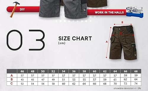 Die CXS Arbeitsshorts zeichnen sich durch eine bequeme Passform aus, die ausreichend Bewegungsfreiheit ermöglicht. Eine beiliegende Größentabelle hilft dabei, die richtige Größe auszuwählen, um optimalen Tragekomfort zu gewährleisten. Dies ist besonders wichtig bei langen Arbeitseinsätzen.