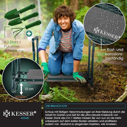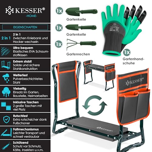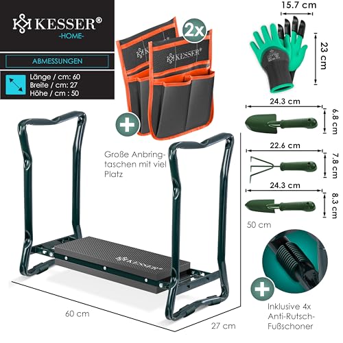 KESSER® 2 in 1 XXL Kniebank für Gartenarbeit Gepolstert Sitzunterlage Eva-Schaumkissen Gartenhocker Klappbar | 2X Werkzeugtasche Handschuhe Gartenkelle & Rechen | Gartenbank 60x50x27cm bis 150 kg