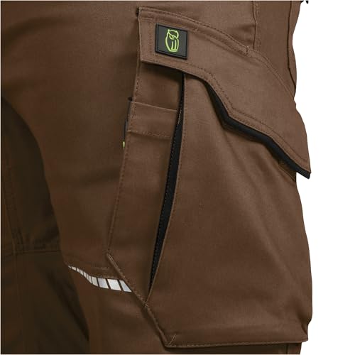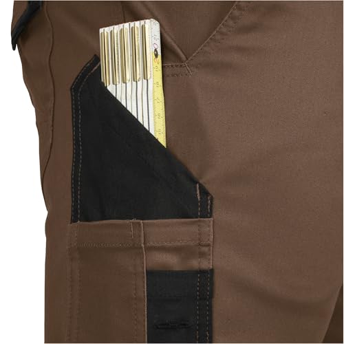 Durch die elastischen Elemente im Stoff bleibt die Hose auch bei intensiven Bewegungen bequem und rutscht nicht. Das ansprechende Farbschema aus Haselnuss und Schwarz macht die Hose zusätzlich zu einer stilvollen Arbeitskleidung.