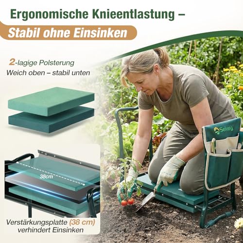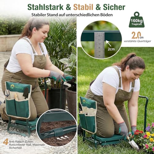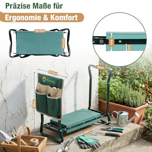 Sekey Höhenverstellbare Kniebank für Gartenarbeit Belastbarkeit 160KG, Gartenhocker Klappbar mit Werkzeugtaschen, Kniehilfe für Gartenarbeiten 60 * 50 * 28 cm, Grün