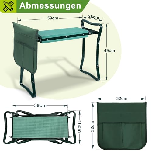 Tubiaz 2 in 1 Kniebank für Gartenarbeit, Gartenhocker mit Eva-Schaumkissen Gepolstert, Klappbar Gartenbank Arbeitshocker mit Werkzeugtasche, Erntebank Klapphocker Kniestuhl, 60 x 50 x 28 cm, Grün