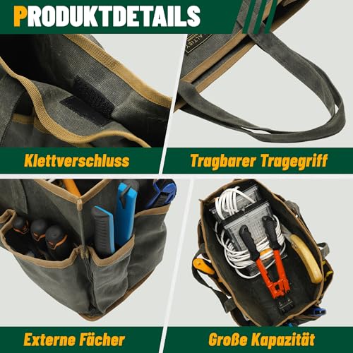 Werkzeug-Tragetasche, 16oz gewachstem Segeltuch Garten Werkzeug Tragetasche (Armee grün), Tragbare 11 Taschen Werkzeugtasche | für Gärtner Elektriker Handwerker | 36 x 14 x 26.5cm